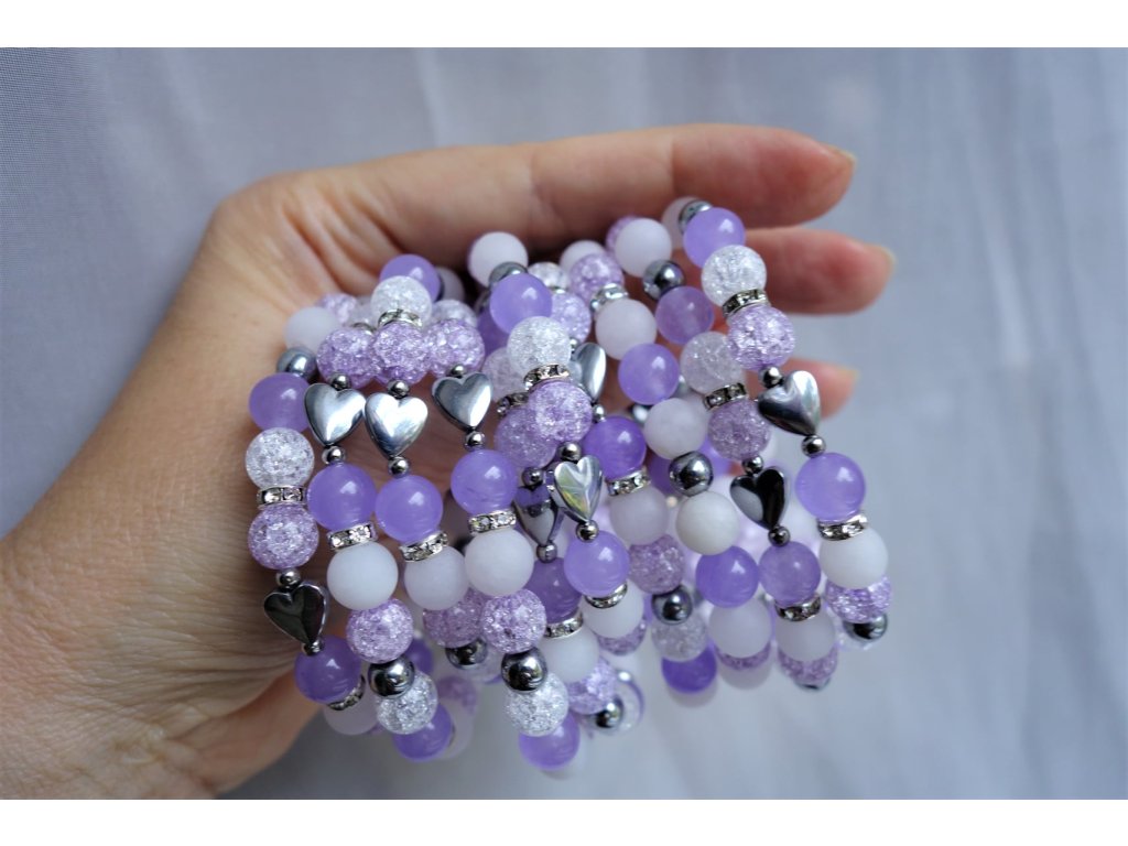 Bílý nefrit v matu, malajský jadeit fialová barva, syntetický práskaný křišťál bílý a fialový - pozor křehký, hematit. srdíčko, perličky, šatonové rondelky.